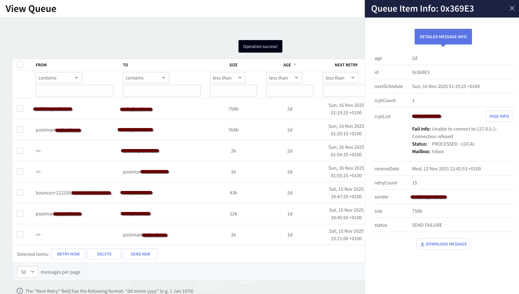 I also saw some odd thing in my logs: SMTP-OUT:00000005: Relay mail 03A627: unable to connect to 127.0.0.1:2500: Connection refused. Why is it trying to connect to port 2500? I have no such port open or configured.