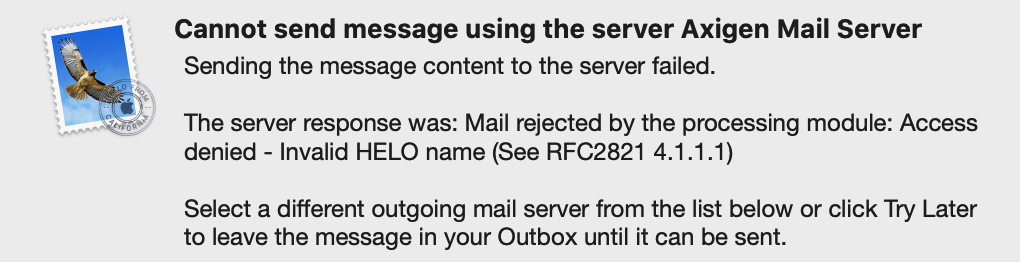 However, when I try to send an email anywhere else, Apple mail pops up the following message