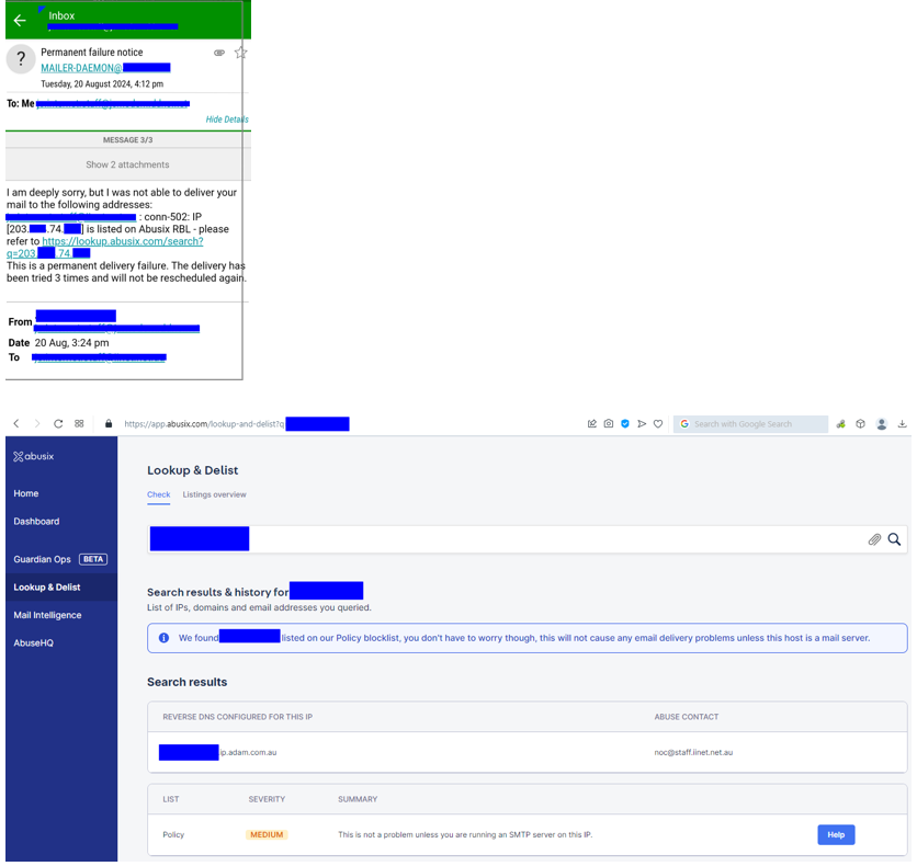Notice the “ABUSE CONTACT” (above) email address, it’s one of my ISP’s email addresses noc@swtaff.iinet.net.au. It seems my ISP has detected that I am running my own Email server upon the 1st email send and then sent an “abuse” email to Abusix.com which results in my internet IP to be blacklisted presumably in the ‘Email Server world’. And notice the SUMMARY: “This is not a problem unless you are running an SMTP server on this IP”.