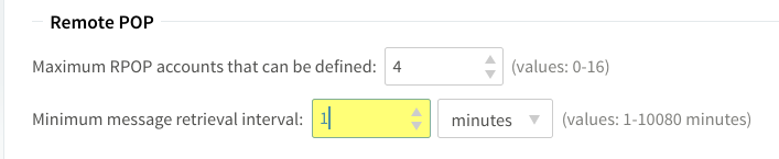 Following back to our discussion, please know that starting with Axigen 10.3.3.3 as long as the account has configured in the WebAdmin under its “quotas and restrictions” page as “minimum message retrieval interval” set to 1 minute, you may also set the retrieval value to 1 minute in WebMail > Settings > Remote Mail.