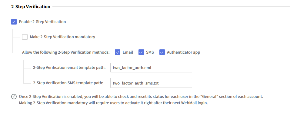 Starting with Axigen X6 (10.6.x), email and SMS have been added as 2-Step Verification methods.