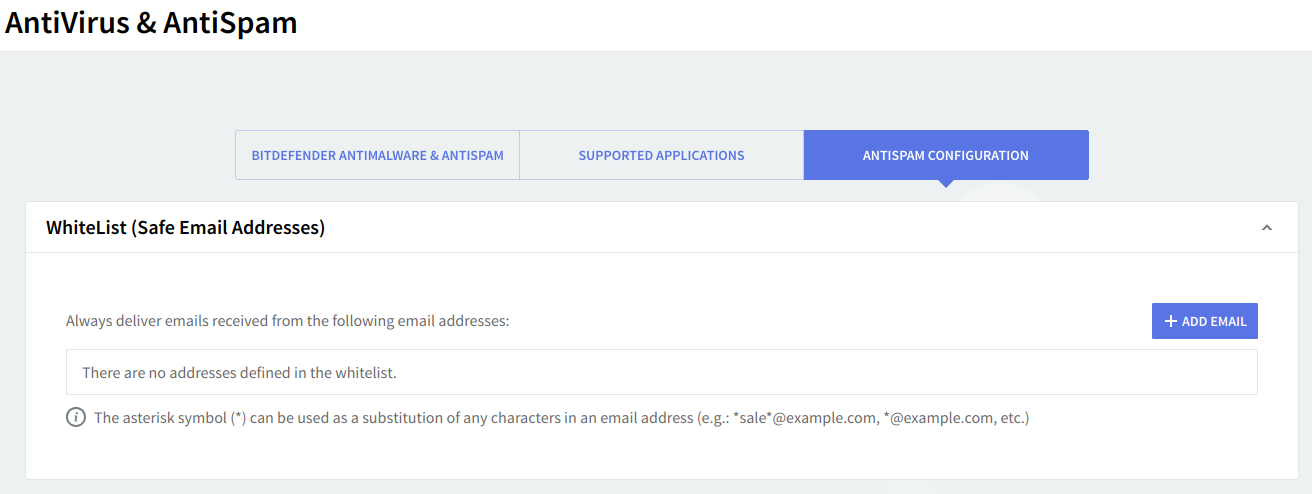 The "AntiVirus & AntiSpam" → "AntiSpam Configuration" page allows you to configure lists of safe email addresses (whitelists) and spam thresholds.