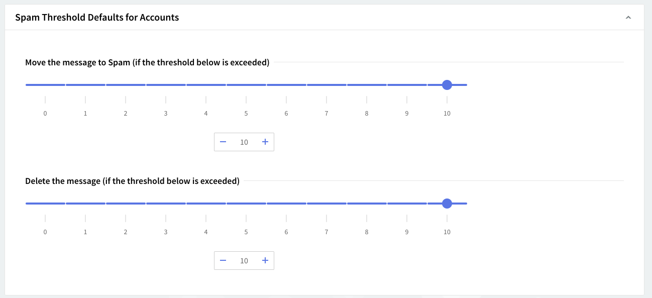Use the sliders or the up and down arrows to set the maximum value for the "Spam Thresholds". Available values range between 1 to 10, where 1 is associated to legitimate emails (Not Spam) and 10 to clearly spam emails (Spam). Exceeding the set values will result in moving the respective email to the "Spam" folder, respectively in deleting the email.