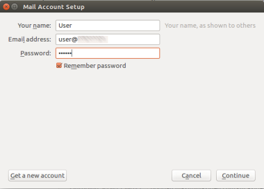 1. From the File menu, select "New" → "Existing Mail Account..." – enter your name, email address, and password and click on "Continue".