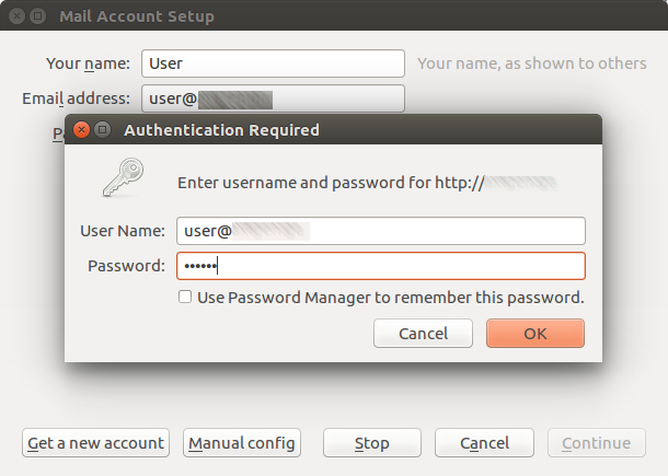 2. The email client will initiate an HTTP requests to check for the "Autoconfig" – enter your email address and password again in this pop-up window and click on "OK".