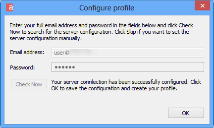 An administrator can define a connector-specific profile using an Auto-discovery mechanism, similar to the one used for the ActiveSync service; this mechanism allows the user to specify only the email address and the password for accessing her or his Axigen account from Outlook, without having to specify additional service-related information (such as hostname or IP address, service port, running mode, etc.); the Auto-discovery can be used both immediately after the installation of the Outlook connector or at a later time.