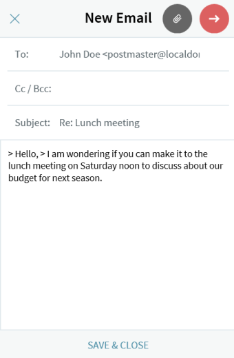 Click "Send" to send the email message, "Save & Close" to save a draft of the current message and resume its editing at a later time, or the "X" button to abandon and return to the section where you previously were;