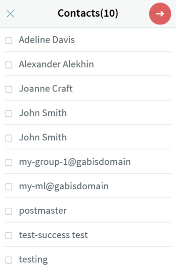 Select one or more contacts by ticking the check-box in front of each contact. Clicking on a contact link returns to composing the email and adds the email address of that contact to the specific field ("To", "Cc" or "Bcc").