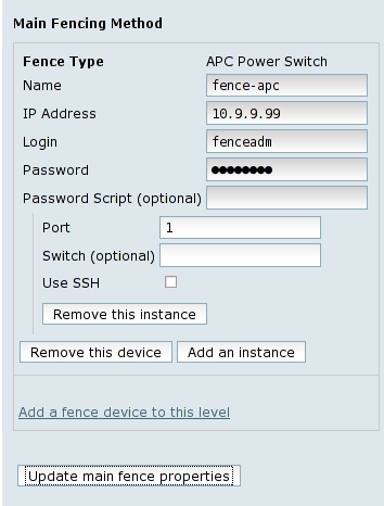 After adding the shared fence device, it must be attached for fencing all nodes. To achieve this, click on the Nodes option from the cluster name left menu and then on each node's entry form the Configure submenu. Clicking on the Manage fencing for this node link will open the node configuration page. Click the Add a fence device to this level link from the Main fencing method panel. From the drop-down list, select the shared fencing device you have previously configured, under the Use an existing fence device option. Fill in any additional parameters, like the switch port or anything else that is requested by the fencing device to recognize this specific node. Click on the Update main fence properties button, confirm the fence addition and wait for the cluster configuration to be updated.