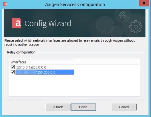 The Axigen Configuration Wizard will then prompt you to select the networks allowed to relay emails through the Axigen server without prior authentication. Check or uncheck the box in front of the option you want to enable, respectively disable.