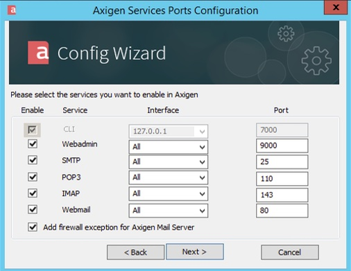 The "Add firewall exception for Axigen Mail Server" option will add Axigen as an exception in the Windows Firewall.