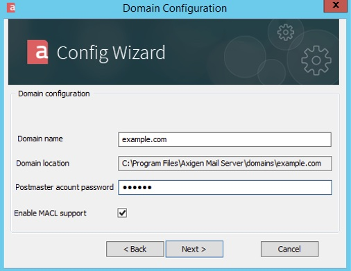 The next stage of running the wizard consists in configuring Axigen’s primary domain. The wizard will automatically detect the machine’s FQDN (Fully Qualified Domain Name) and based on it will propose the domain name as primary. If no domain can be detected, the default "localdomain" will be displayed. You can edit the fields of this tab at any time.