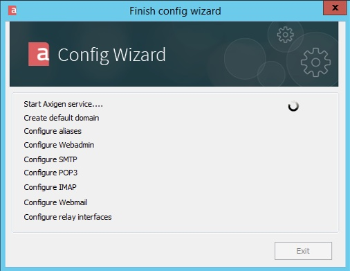 After completing the configurations, the wizard screen will also show the WebAdmin link and the "Exit" button will be highlighted. Left-click on "Exit" to close the Axigen Configuration Wizard.
