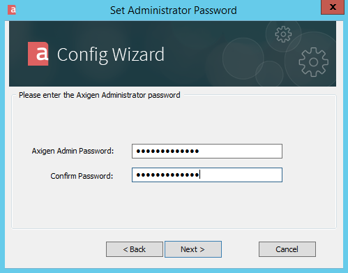 After starting the Axigen Configuration Wizard, the first step you are prompted to take is to specify the admin password. The password is mandatory, therefore you must type one in and confirm it.