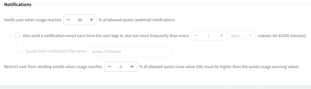 To notify the account user (through a pop-up displayed when accessing the WebMail interface) when a certain level of the allowed quota is reached, check the respective option in the 'Notifications' area and edit the default percentage. You can also choose to have the user notified at every login via an email and control the frequency of these login notifications. The frequency of these login notifications can be set using the up and down arrows corresponding to this additional option. To select if the respective value is calculated in minutes, hours or days use the respective drop-down menu.