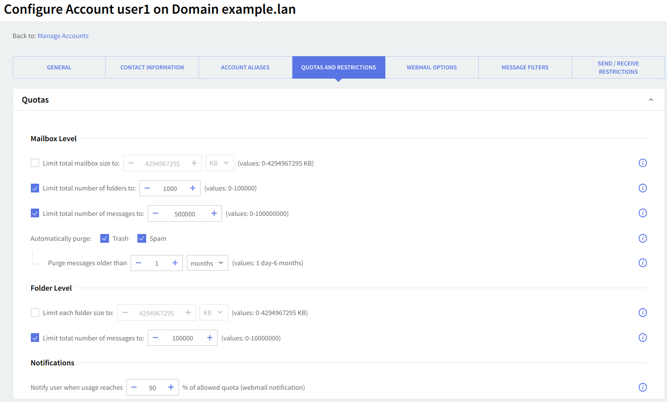 At the mailbox level, the total mailbox size, the total number of folders, and the total number of messages can be limited by selecting the respective options in the "Mailbox" area and using the up and down arrows to adjust the limits to the desired value. For the total size limit, use the available drop-down menu to select if you want it calculated in KB, MB, or GB.