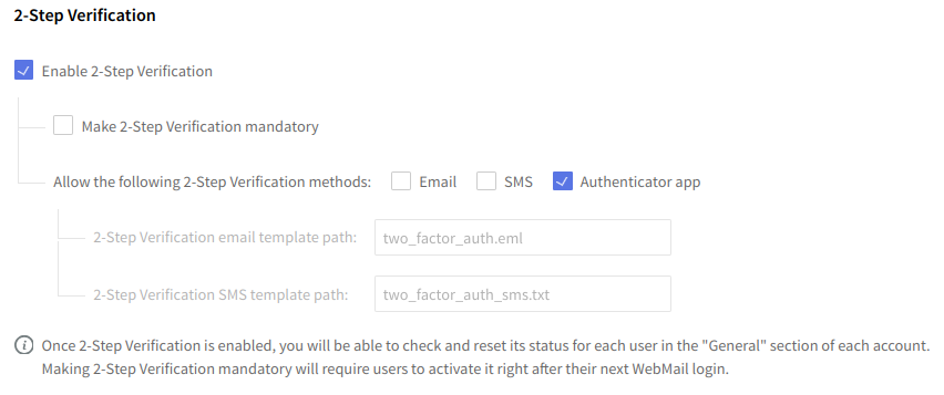 Important: After enabling 2-Step Verification, you can manage and reset 2SV settings for individual users in the "General" section of each user account. Making 2SV mandatory will prompt users to activate 2SV upon their next login to WebMail.