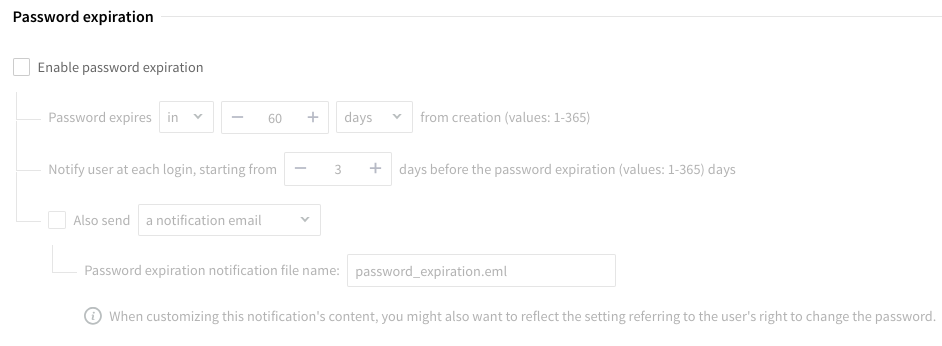 In this section you can enable, by checking the related box, the "Enable password expiration" option and then customize the password expiration and related notifications in compliance with your requirements.