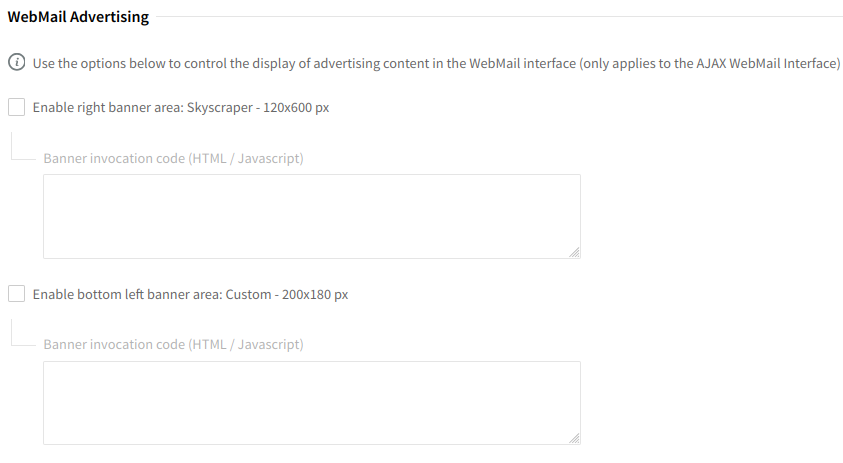 In the "WebMail Advertising" area, you can configure the three advertising sections of the interface (only pertaining to AJAX WebMail interface) by inserting appropriate HTML code in the corresponding parts. We recommend respecting the maximum size specified for each section.