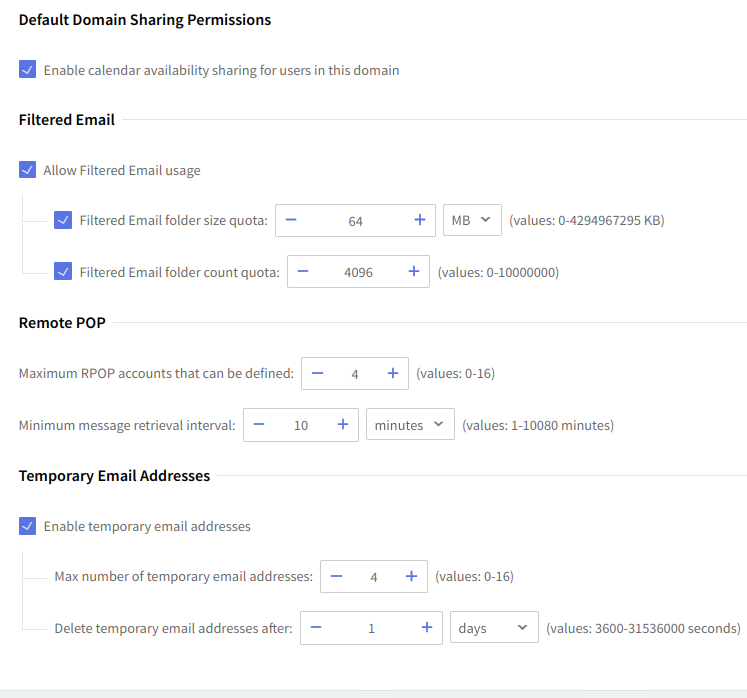 At the folder level, you can set limits for the size of each folder and the total number of messages per folder by checking the respective options in the Folders section and using the up and down arrows to adjust the limits to the desired value. For the folder size limit, use the available drop-down menu to select if you want it calculated in KB, MB, or GB. The maximum possible value for "total size limit" is 1 KB lower than 4096 GB.