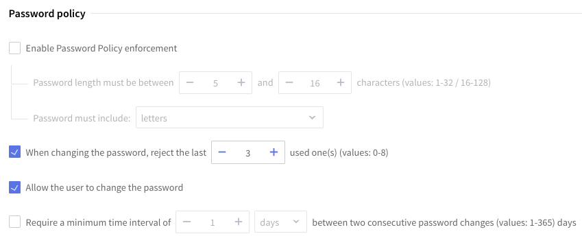 You can define a Password Policy to be enforced for the currently created account. First of all, a minimum and maximum number of characters for each password can be set using the up and down arrows or directly editing the Password length parameters text field. Further, select from the Password must include a drop-down menu if passwords should include letters, letters, and numbers or letters, numbers, and special characters. You can also set specific password-changing options like the number of previous passwords that should not be accepted as the new password, a minimum period between two password changes, and if the user is allowed to change the password.