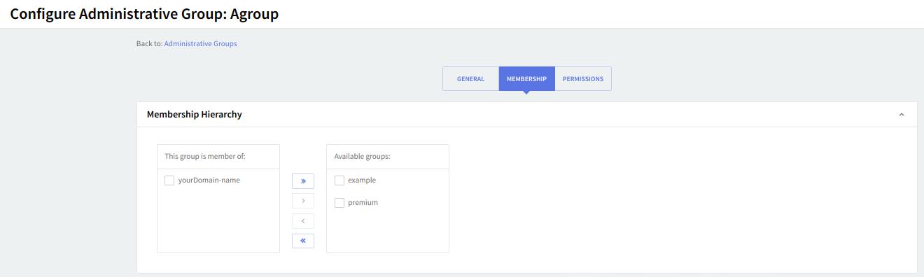 The "Administrative Groups" → "Membership" sub-page allows you to further configure administrative groups by specifying their hierarchy among the other existing groups.