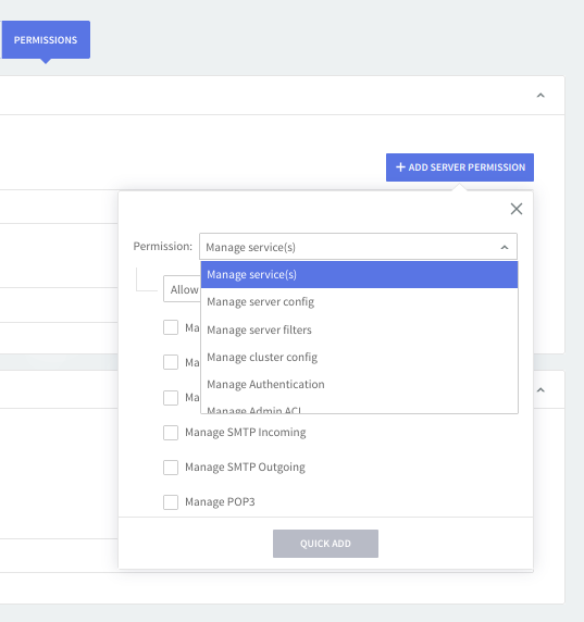 Click on the "Add server permission" button, then use the available drop-down menus to configure the new permission by choosing the service and action to be taken relative to the selected module. Available actions are: "Allow" and "Deny". Hit the "Quick Add" button to finalize the addition of the new configuration.