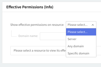 Click on the "Effective Permissions" section for complete information about the permissions available for the configured administrative group at different levels (resources): server, any domain, or a specific domain. The displayed information will include all information for a certain resource as it results from the inheritance of its parents' permissions combined with the permissions assigned directly to this group.