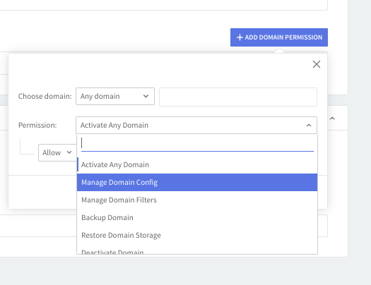 Click on the "Add domain permission" button and use the available drop-down menus to configure the new permission by choosing the service and action relative to the selected module. Available actions are: "Allow" and "Deny". Hit the "Quick Add" button to finalize the addition of the new configuration.