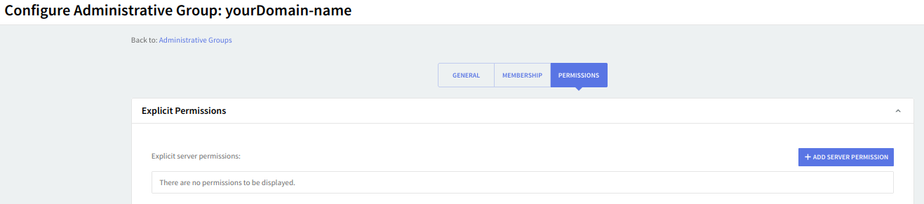 Check the "Explicit domain permissions" section for a list of the already defined server domain permissions for the configured administrative group. Should you like to edit or delete any of the existing permissions use the corresponding "Change" and "Remove" options. To delete all permissions relative to a certain service just hit the "Remove all" button. To add new server permissions for the configured administrative group click the "Add domain permission" button and fill in the requested details.