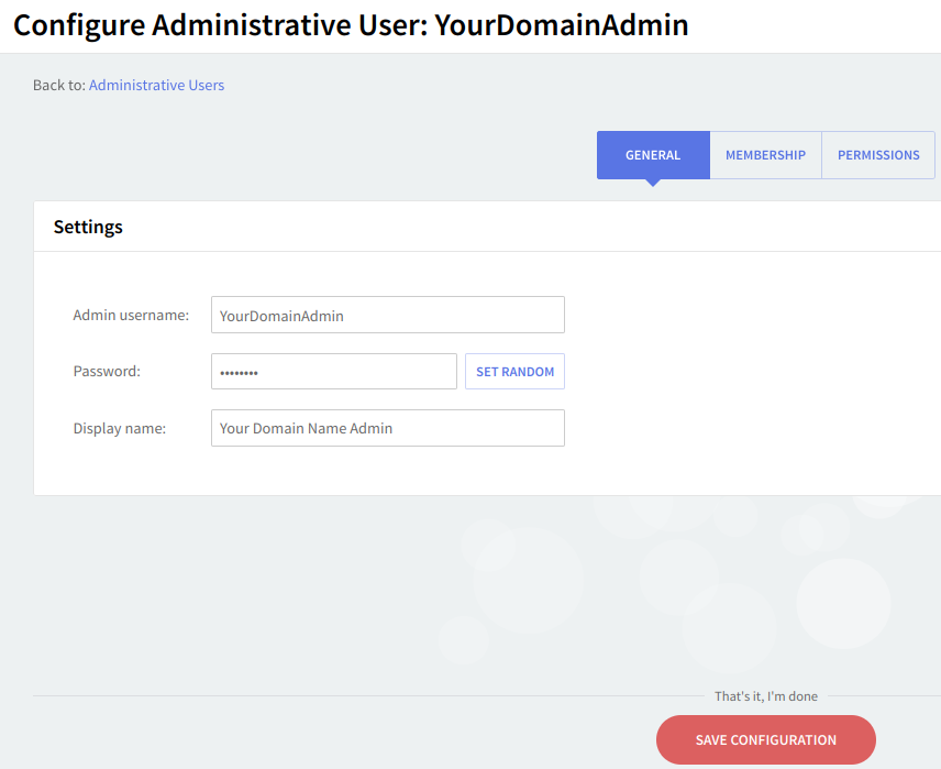 The "Administrative Users" → "Permissions" page allows you to specify the parameters relative to the server and domain permissions for the configured administrative user.