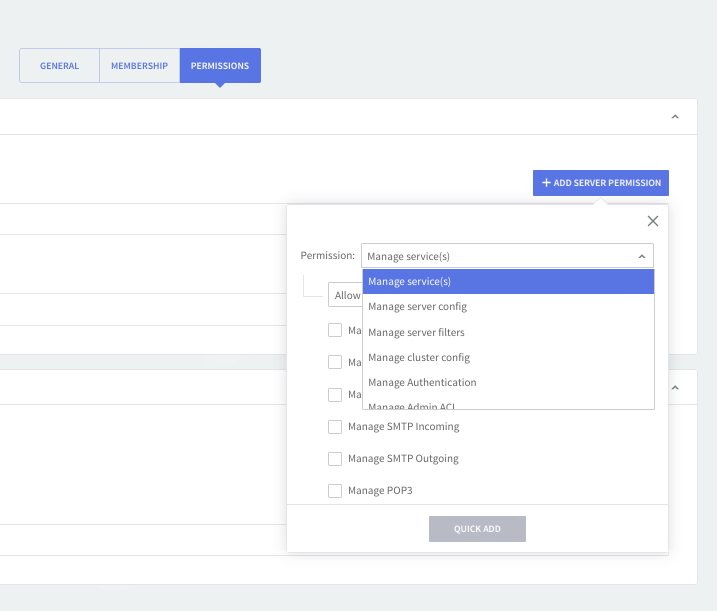 Click on the "Add server permission" button, then use the available drop-down menus to configure the new permission by choosing the service and action to be taken relative to the selected module. Available actions are: "Allow" and "Deny". Hit the "Quick Add" button to finalize the addition of the new configuration.