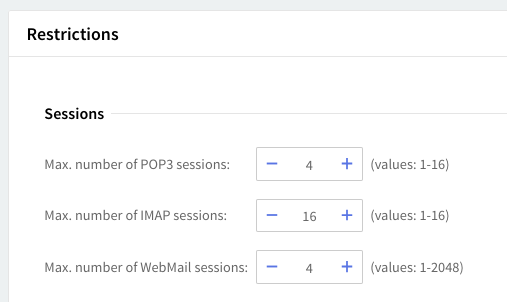 The number of POP3, IMAP, and WebMail sessions can be limited using the up and down arrows or directly editing the text fields of each type of session. POP3 and IMAP sessions take values from 1 to 16, while WebMail sessions take values from 1 to 2048.