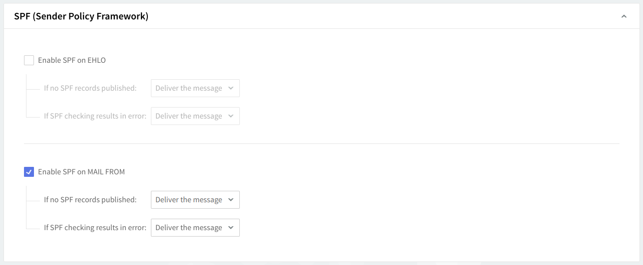 Enable SPF checking by checking the box in front of it, then use the drop-down menus in order to select the actions to be taken if no SPF records are published or if SPF records cannot be checked. Choose between allowing to deliver the message or deleting the message.