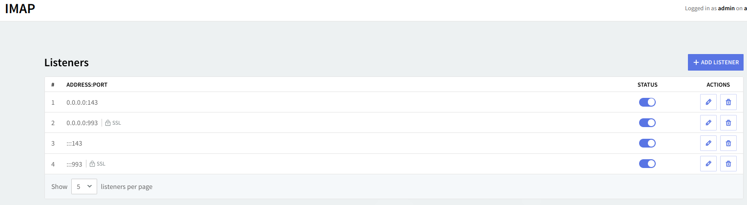 The first section in the IMAP tab is "Listeners". Here you can add, delete, or edit the TCP socket listeners for the IMAP service.