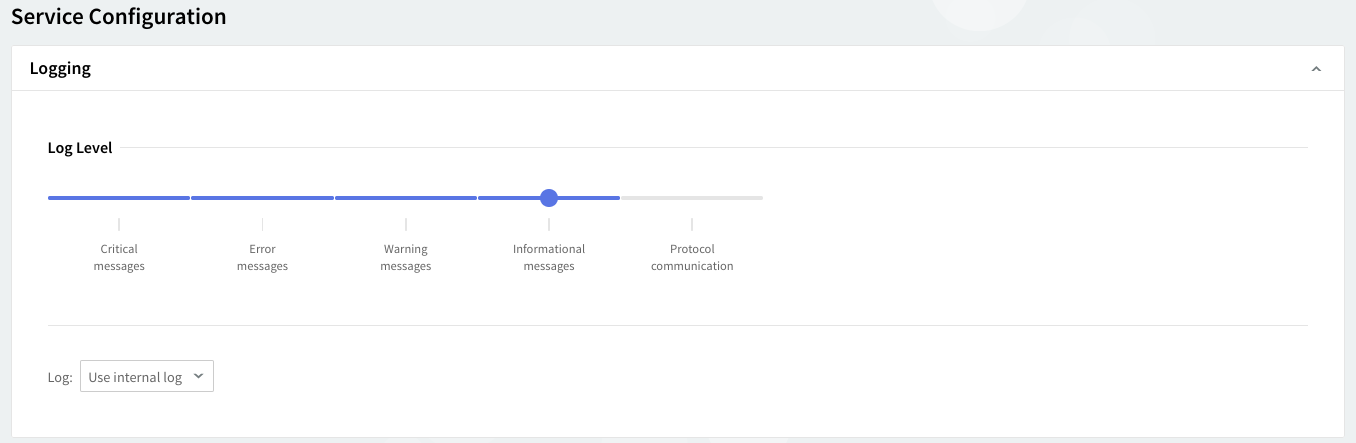 The log level can be set in the "Logging" section with the use of the slider, by moving it to the left or to the right, depending on how detailed the logging information should be. The selected types of messages will change color from transparent to grey. Please note that the log level values are cumulative (i.e. setting the log level to Warning messages will also log "Critical messages" and "Error messages").