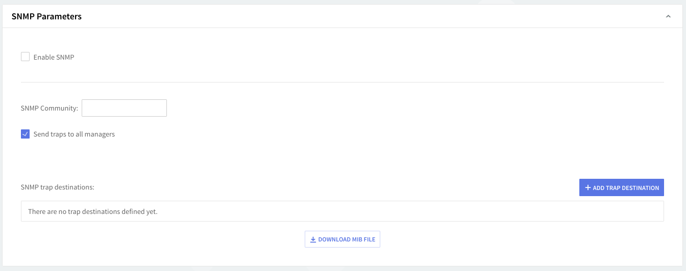 combinations to it. To add a new trap destination fill in the details in the corresponding text field and click the "Add" button. "Trap Destinations" can be edited directly in the field they are displayed in or deleted by clicking their corresponding "Delete" button.