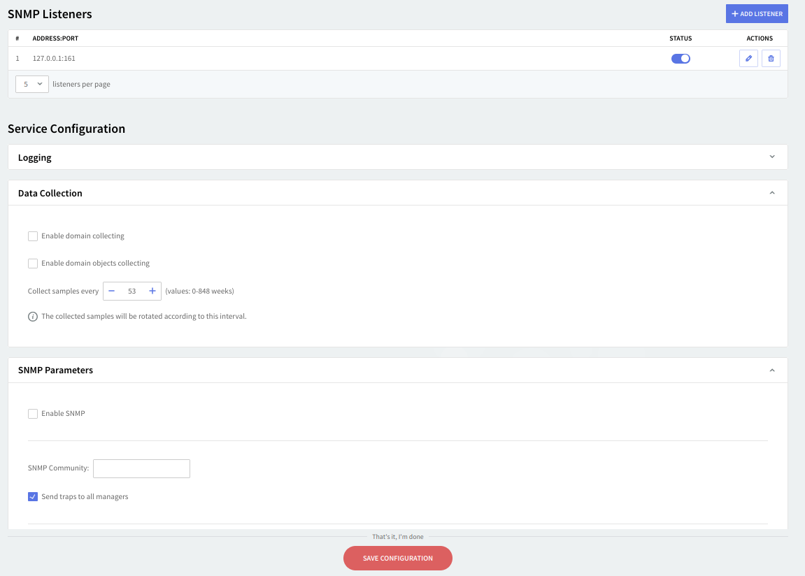 In this section, SNMP can be enabled by checking the box in front of it. Axigen supports SNMP Traps that can be set either for connected managers or specific IPs by checking the "SNMP Send Traps To All Managers" option or defining an SNMP Community and adding IP:Port