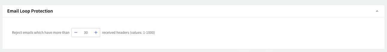 A looping message is an email sent from one mail server to another, without reaching its destination. Whenever an email is processed by a mail server, a "Received" header is appended to it. To prevent excessive traffic on your mail server, enable the "Email Loop Protection" option and specify a maximum number of "Received" headers for incoming emails. This feature helps avoid an infinite email loop caused by misconfigurations. You can set values between 1 and 1000, though the default value of 30 is recommended.