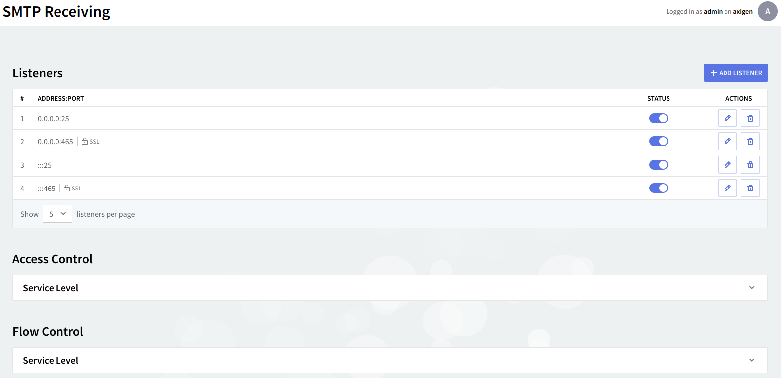 The "SMTP Receiving" tab allows you to configure parameters relative to this specific service's configuration, to add listeners, and manage access to the service by adding rules applicable to all existing listeners.