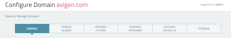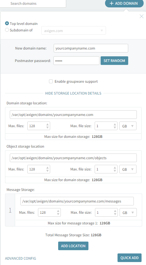 Axigen stores each created domain in a unique domain location. The default location in Axigen is: