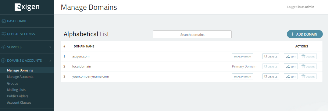 After defining your first domain, it will be set as primary domain. This will be considered your default domain for all incoming mail. You can make any domain primary at any time by pressing the corresponding "Make primary" button in the Domain list.