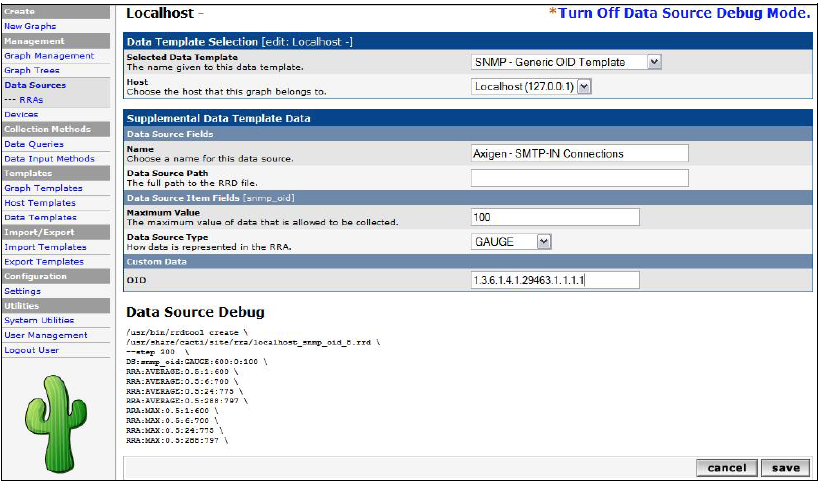 - The "Data Source Type" parameter will tell Cacti how to interpret the values read from the data input. Since Axigen uses an incremental value, it required to set this parameter to the COUNTER value.