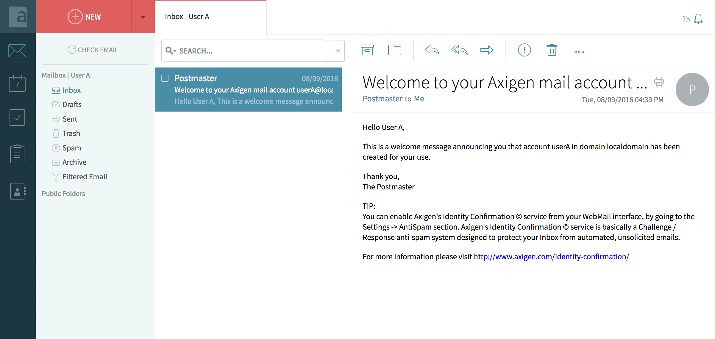 In this example, we have User A (userA@localdomain) who has 1 email in her Inbox.