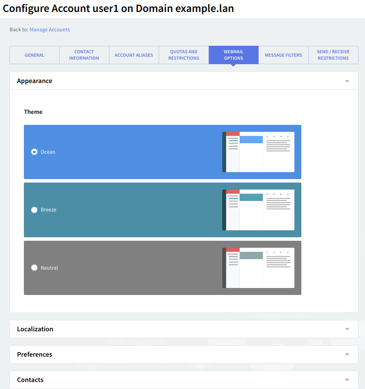 Choose the default WebMail theme to be used for this account. Users will be able to change the theme from the WebMail directly, so this is only the default theme to be used.