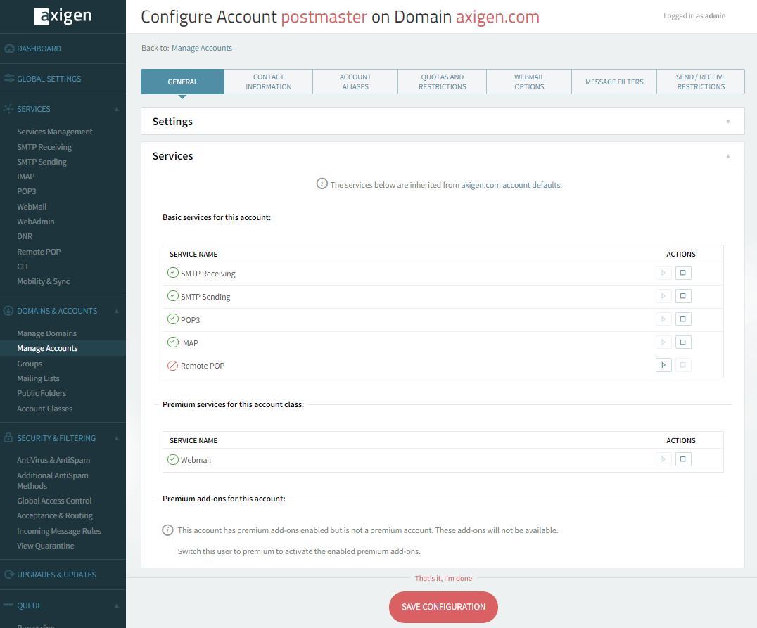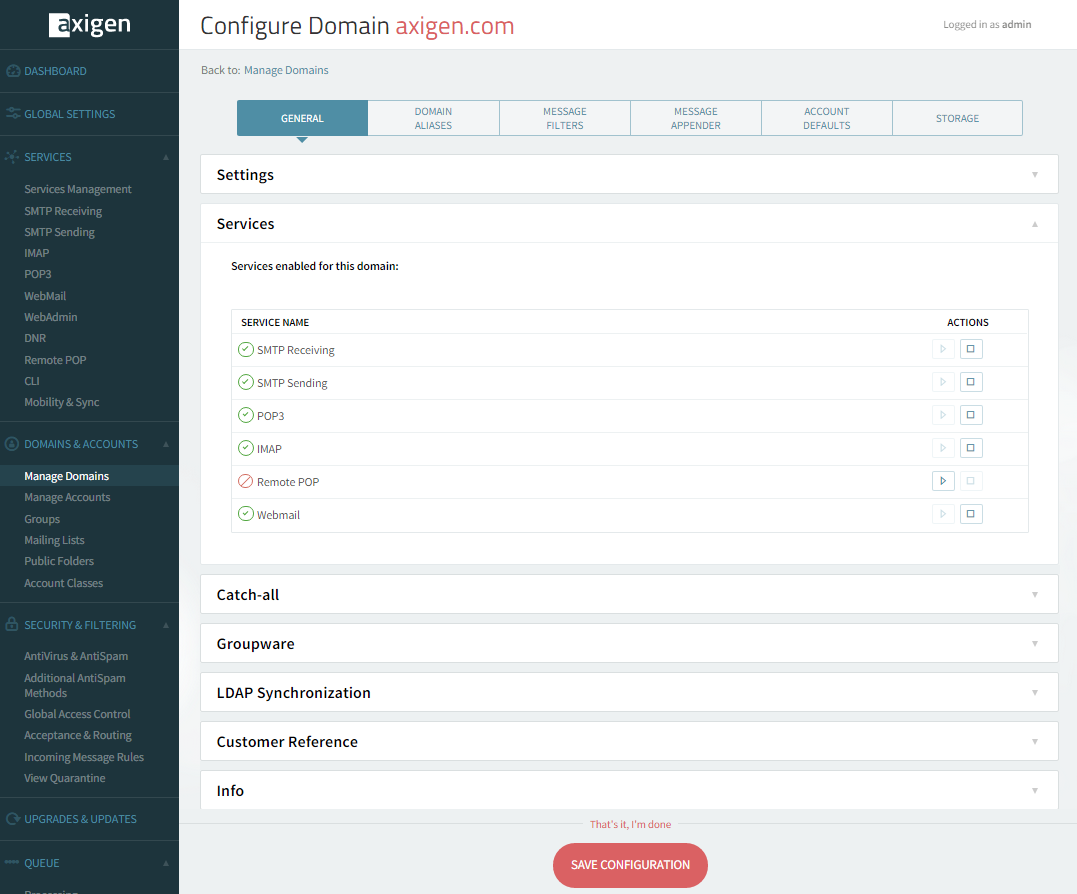 In case a service is disabled at server level and enabled at domain level, the users defined on that domain will not be able to use the service. When disabling a service at server level, the configuration is not inherited by the domain or user levels.