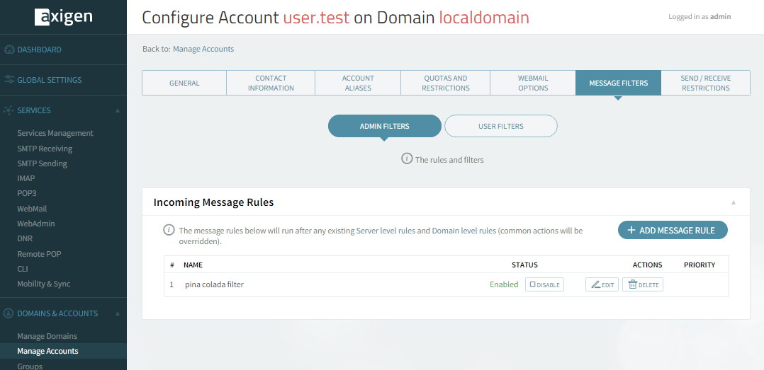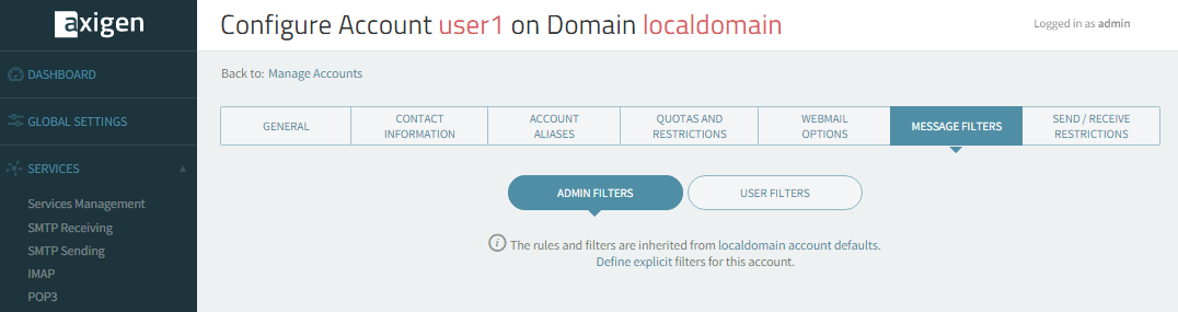The "Message Filters → Admin Filters" sub-page enables you to configure incoming message rules and filters for specific user accounts.