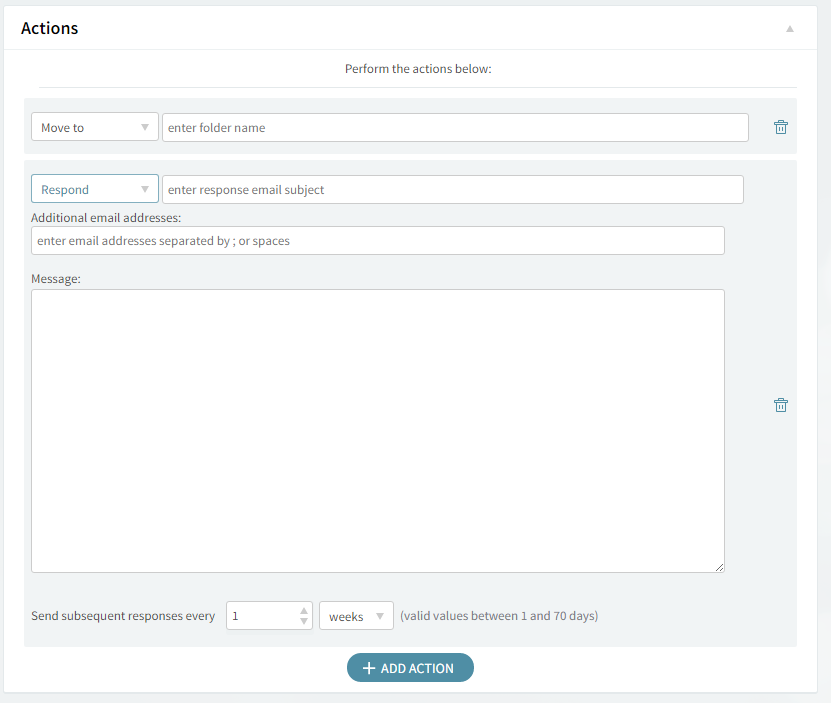 To add a new action, click on the "Add Action" button and then fill in all the corresponding details in the newly displayed menus. To delete an action, hit the trash-bin shaped button displayed on the right hand side of the action in question.