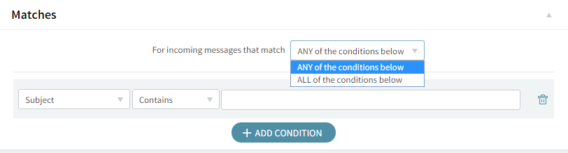 Use the drop-down menu to select the type of the new condition. Available options include setting conditions relative to the subject, sender, receiver, Cc, To or Cc, size of the email, as well as a customization option, accessible by clicking on "Custom". To delete one of the newly added criteria, hit its corresponding trash-bin shaped button.