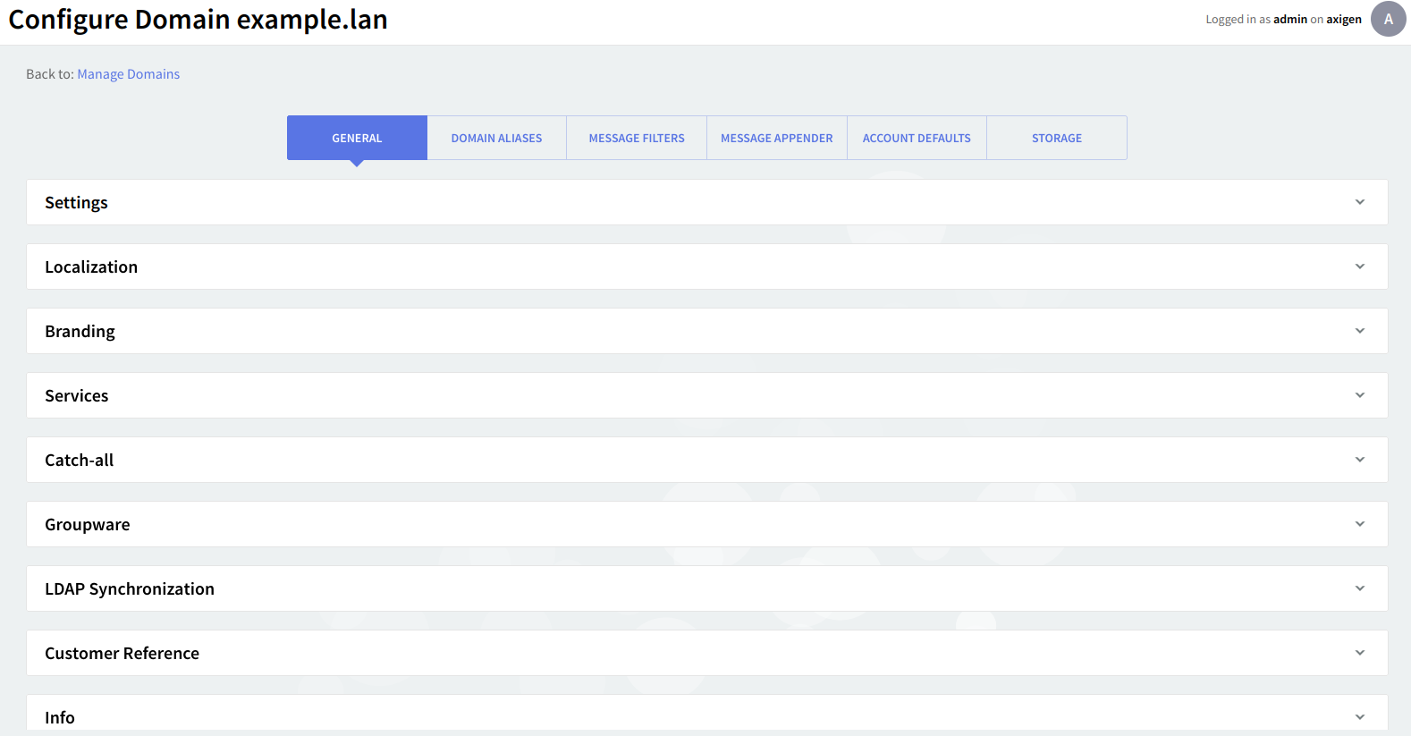 When pressing the "Edit" button for an existing domain or the "Advanced Config" link, you access the sections shown in the below screenshot. The name of the configured domain is listed in the upper section of the screen at all times.